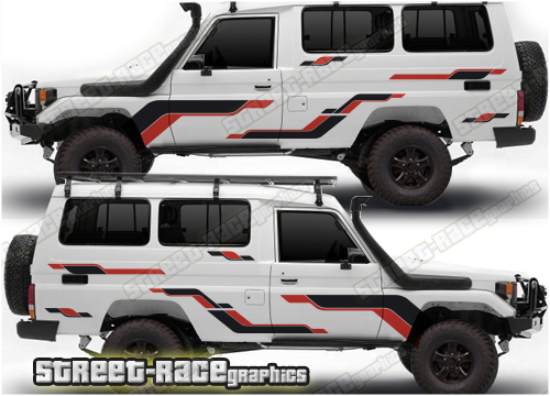 Toyota Land Cruiser 70 series graphics. They are shown on the larger Troop Carrier but they can be trimmed to fit any of the 70 (J70) series variants (Troopy, Wagon, Single Cab, Dual cab, Pickup, Workmate etc). These variants include the 73, 75, 76, 78 and 79 series. The decals are not pre-cut for the wheel arch shape, so they can be fitted with or without after-market flares.