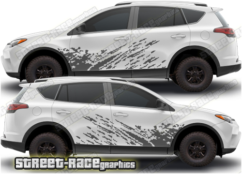 Toyota RAV4 graphics. They are shown on the fourth generation RAV4 but they can be trimmed to fit the MK2 and MK3, plus the later EV versions. The decals are not pre-cut for any specific RAV4 version; they do not have any door handle cutouts, wheel arch or door line splits. These will require trimming during fitting. Vinyl will not stick to unpainted textured plastic, so the graphics are not suitable for the first generation RAV4.