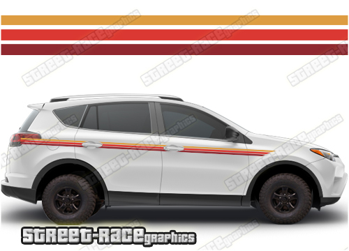 Toyota RAV4 RETRO graphics. They are shown on the fourth generation RAV4 but they can be trimmed to fit the MK2 and MK3, plus the later EV versions. The decals are not pre-cut for any specific RAV4 version; they do not have any door handle cutouts, wheel arch or door line splits. These will require trimming during fitting. Vinyl will not stick to unpainted textured plastic, so the graphics are not suitable for the first generation RAV4.