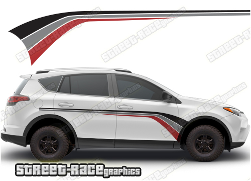 Toyota RAV4 graphics. They are shown on the fourth generation RAV4 but they can be trimmed to fit the MK2 and MK3, plus the later EV versions. The decals are not pre-cut for any specific RAV4 version; they do not have any door handle cutouts, wheel arch or door line splits. These will require trimming during fitting. Vinyl will not stick to unpainted textured plastic, so the graphics are not suitable for the first generation RAV4.