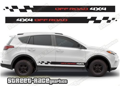 Toyota RAV4 graphics. They are shown on the fourth generation RAV4 but they can be trimmed to fit the MK2 and MK3, plus the later EV versions. The decals are not pre-cut for any specific RAV4 version; they do not have any door handle cutouts, wheel arch or door line splits. These will require trimming during fitting. Vinyl will not stick to unpainted textured plastic, so the graphics are not suitable for the first generation RAV4.