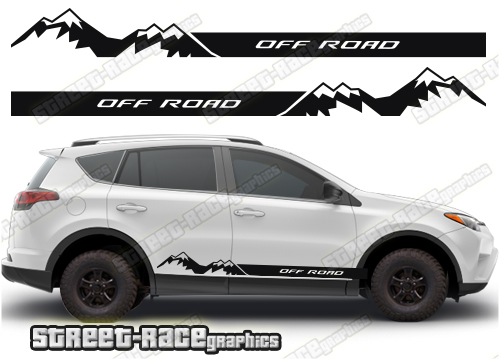 Toyota RAV4 graphics. They are shown on the fourth generation RAV4 but they can be trimmed to fit the MK2 and MK3, plus the later EV versions. The decals are not pre-cut for any specific RAV4 version; they do not have any door handle cutouts, wheel arch or door line splits. These will require trimming during fitting. Vinyl will not stick to unpainted textured plastic, so the graphics are not suitable for the first generation RAV4.