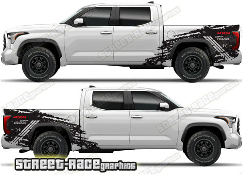 Toyota Tundra large graphics. They are shown on the 4th generation dual cab Toyota Tundra, but they can be trimmed to fit all earlier versions and facelift variants. The decals do not have any door handle cutouts, wheel arch or door line splits. These will require trimming during fitting. Vinyl will not stick to unpainted textured plastics.