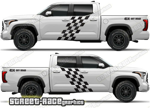 Toyota Tundra large graphics. They are shown on the 4th generation dual cab Toyota Tundra, but they can be trimmed to fit all earlier versions and facelift variants. The decals do not have any door handle cutouts, wheel arch or door line splits. These will require trimming during fitting. Vinyl will not stick to unpainted textured plastics.