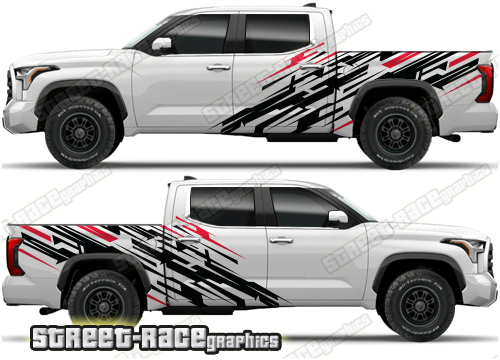 Toyota Tundra large graphics. They are shown on the 4th generation dual cab Toyota Tundra, but they can be trimmed to fit all earlier versions and facelift variants. The decals do not have any door handle cutouts, wheel arch or door line splits. These will require trimming during fitting. Vinyl will not stick to unpainted textured plastics.