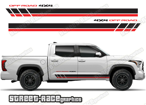 Toyota Tundra racing stripes. They are shown on the 4th generation dual cab Toyota Tundra, but they can be made / trimmed fit all earlier versions and facelift variants. The decals do not have any door handle cutouts, wheel arch or door line splits. These will require trimming during fitting. Vinyl will not stick to unpainted textured plastics.