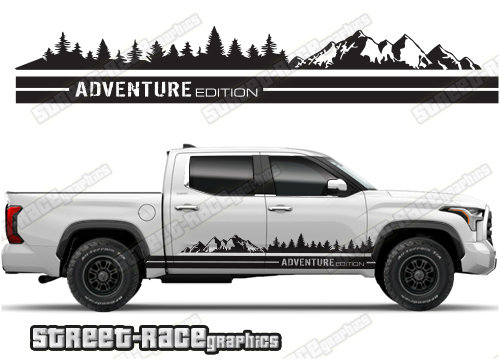 Toyota Tundra racing stripes. They are shown on the 4th generation dual cab Toyota Tundra, but they can be made / trimmed fit all earlier versions and facelift variants. The decals do not have any door handle cutouts, wheel arch or door line splits. These will require trimming during fitting. Vinyl will not stick to unpainted textured plastics.