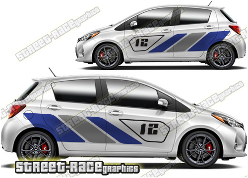 Toyota Yaris graphics. These large race-inspired decals are perfect for both street, rally and track-day cars. They are a universal fit to suit all Toyota Yaris cars and facelift variants from MK3 onwards. There are no cutouts for the door handles, wheel arches or door lines; these will require trimming during fitting.