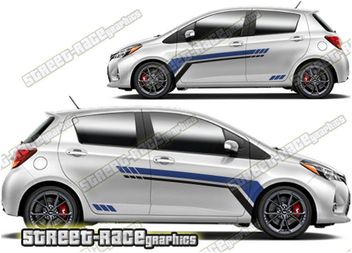 Toyota Yaris graphics. These large race-inspired decals are perfect for both street, rally and track-day cars. They are a universal fit to suit all Toyota Yaris cars and facelift variants from MK3 onwards. There are no cutouts for the door handles, wheel arches or door lines; these will require trimming during fitting.