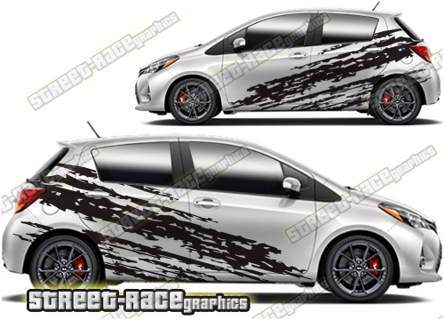Toyota Yaris graphics. These large race-inspired decals are perfect for both street, rally and track-day cars. They are a universal fit to suit all Toyota Yaris cars and facelift variants from MK3 onwards. There are no cutouts for the door handles, wheel arches or door lines; these will require trimming during fitting.