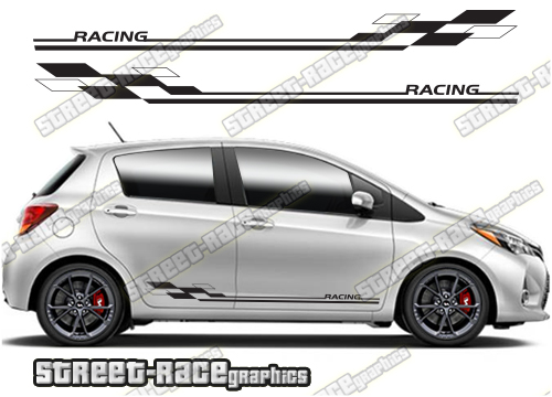 Toyota Yaris racing stripes. They are a universal fit to suit all Toyota Yaris cars and facelift variants from MK2 onwards. There are no cutouts for the wheel arches or door lines; these will require trimming during fitting.