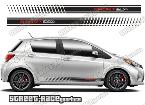 Toyota Yaris racing stripes. They are a universal fit to suit all Toyota Yaris cars and facelift variants from MK2 onwards. There are no cutouts for the wheel arches or door lines; these will require trimming during fitting.