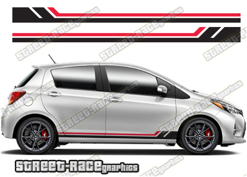 Toyota Yaris racing stripes. They are a universal fit to suit all Toyota Yaris cars and facelift variants from MK2 onwards. There are no cutouts for the wheel arches or door lines; these will require trimming during fitting.