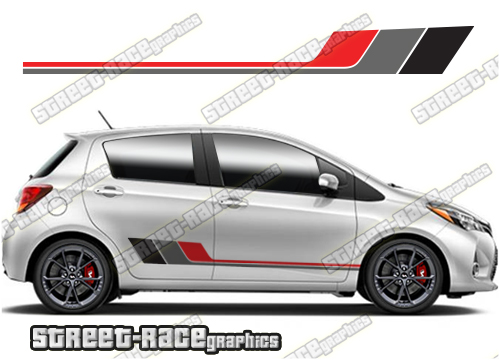 Toyota Yaris racing stripes. They are a universal fit to suit all Toyota Yaris cars and facelift variants from MK2 onwards. There are no cutouts for the wheel arches or door lines; these will require trimming during fitting.