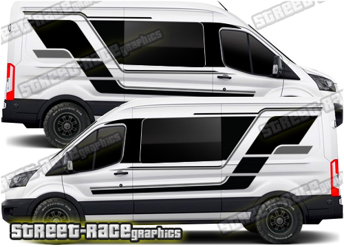 Ford Transit MK8 campervan graphics kits. These are ideal for giving your existing camper a new look or to finish off a new camper conversion project. Shown on the L3 (LWB) van. We can also make them to suit the L1 (SWB) to L4 (XLWB) van (choose the wheelbase length from the menu).