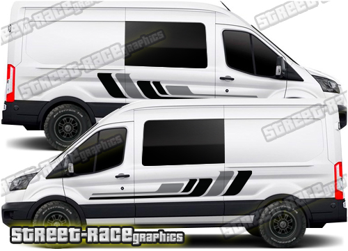 Ford Transit MK8 campervan graphics kits. These are ideal for giving your existing camper a new look or to finish off a new camper conversion project. Shown on the L3 (LWB) van. We can also make them to suit the L1 (SWB) to L4 (XLWB) van (choose the wheelbase length from the menu).