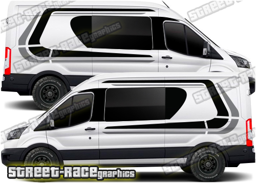 Ford Transit MK8 campervan graphics kits. These are ideal for giving your existing camper a new look or to finish off a new camper conversion project. Shown on the L3 (LWB) van. We can also make them to suit the L1 (SWB) to L4 (XLWB) van (choose the wheelbase length from the menu).