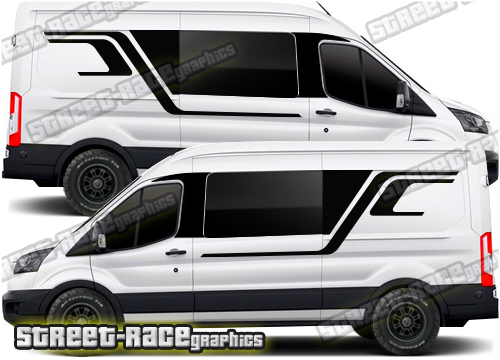 Ford Transit MK8 campervan graphics kits. These are ideal for giving your existing camper a new look or to finish off a new camper conversion project. Shown on the L3 (LWB) van. We can also make them to suit the L1 (SWB) to L4 (XLWB) van (choose the wheelbase length from the menu).
