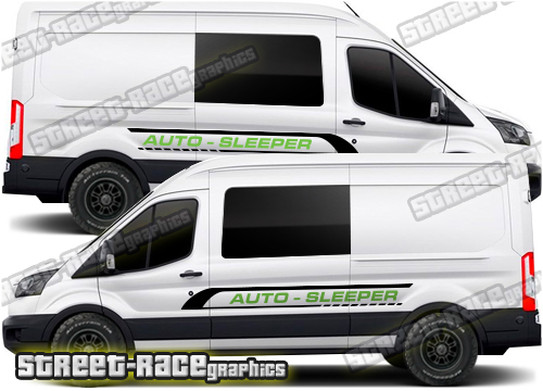 Ford Transit MK8 camper van graphics kits. These are ideal for giving your existing camper a new look or to finish off a new camper conversion project. Shown on the L3 (LWB) van. We can also make them to suit the L1 (SWB) to L4 (XLWB) van (choose the wheelbase length from the menu).