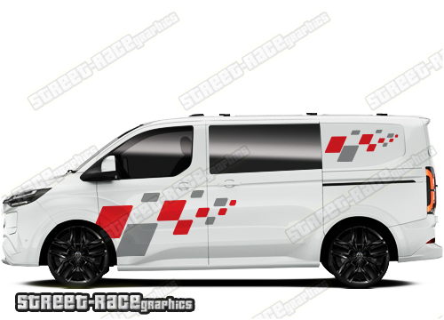 Ford Transit Custom MK2 graphics (2024 onwards). These graphics are shown on a SWB Transit Custom, but we can make them longer to fit the LWB Custom – choose the length required from the menu.