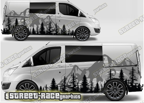Transit Custom large Mountain Edition side graphics. These graphics are shown on a SWB Transit Custom, we can also make them to fit the LWB Custom. These graphics are layered – the mountains are fitted to the van first, then the trees are fitted on top.