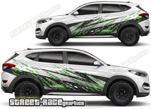 Hyundai Tuscon graphics (Also known as Hyundai ix35). They are shown on the third generation Tuscon but they can be trimmed to fit all other versions and facelift variants. The decals are not pre-cut for any specific Tuscon/ix35 version; they do not have any door handle cutouts, wheel arch or door line splits. These will require trimming during fitting. Vinyl will not stick to unpainted textured plastics.
