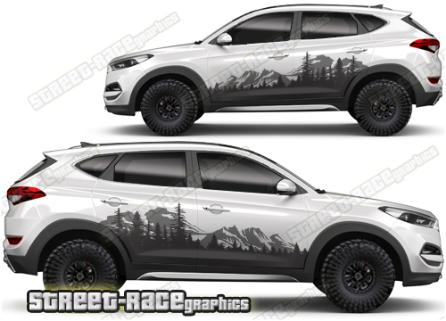 Hyundai Tuscon graphics (Also known as Hyundai ix35). They are shown on the third generation Tuscon but they can be trimmed to fit all other versions and facelift variants. The decals are not pre-cut for any specific Tuscon/ix35 version; they do not have any door handle cutouts, wheel arch or door line splits. These will require trimming during fitting. Vinyl will not stick to unpainted textured plastics.