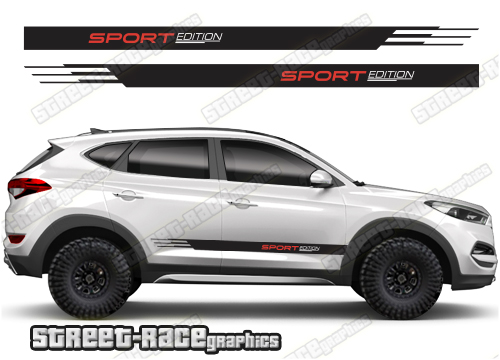 Hyundai Tuscon racing stripes (Also known as Hyundai ix35). They are shown on the third generation Tuscon but they can be trimmed to fit all other versions and facelift variants. The decals are not pre-cut for any specific Tuscon/ix35 version; they do not have any door handle cutouts, wheel arch or door line splits. These will require trimming during fitting. Vinyl will not stick to unpainted textured plastics.