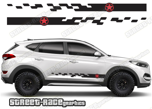 Hyundai Tuscon racing stripes (Also known as Hyundai ix35). They are shown on the third generation Tuscon but they can be trimmed to fit all other versions and facelift variants. The decals are not pre-cut for any specific Tuscon/ix35 version; they do not have any door handle cutouts, wheel arch or door line splits. These will require trimming during fitting. Vinyl will not stick to unpainted textured plastics.