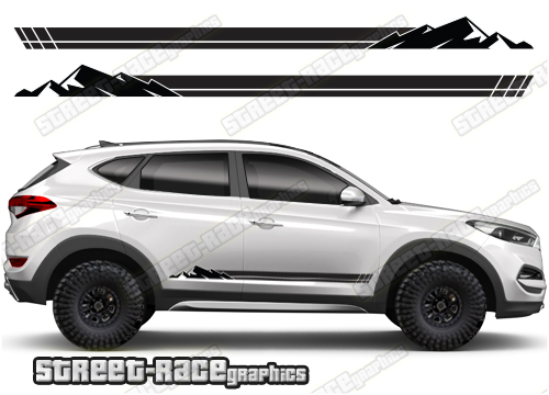 Hyundai Tuscon racing stripes (Also known as Hyundai ix35). They are shown on the third generation Tuscon but they can be trimmed to fit all other versions and facelift variants. The decals are not pre-cut for any specific Tuscon/ix35 version; they do not have any door handle cutouts, wheel arch or door line splits. These will require trimming during fitting. Vinyl will not stick to unpainted textured plastics.