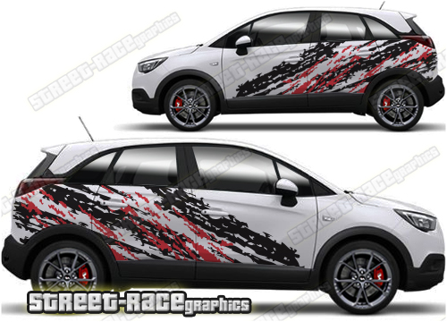 Vauxhall Crossland graphics. They are shown on the first generation Crossland but they can be trimmed to fit all later versions and facelift variants. The decals are not pre-cut for any specific Vauxhall Crossland version; they do not have any door handle cutouts, wheel arch or door line splits. These will require trimming during fitting. Vinyl will not stick to unpainted textured plastics.