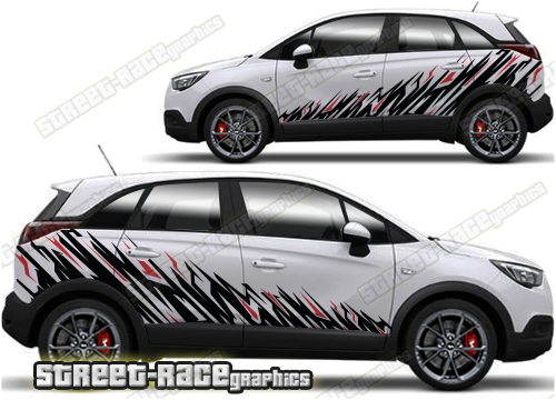 Vauxhall Crossland graphics. They are shown on the first generation Crossland but they can be trimmed to fit all later versions and facelift variants. The decals are not pre-cut for any specific Vauxhall Crossland version; they do not have any door handle cutouts, wheel arch or door line splits. These will require trimming during fitting. Vinyl will not stick to unpainted textured plastics.