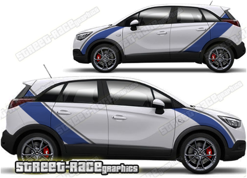 Vauxhall Crossland graphics. They are shown on the first generation Crossland but they can be trimmed to fit all later versions and facelift variants. The decals are not pre-cut for any specific Vauxhall Crossland version; they do not have any door handle cutouts, wheel arch or door line splits. These will require trimming during fitting. Vinyl will not stick to unpainted textured plastics.