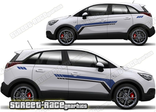 Vauxhall Crossland graphics. They are shown on the first generation Crossland but they can be trimmed to fit all later versions and facelift variants. The decals are not pre-cut for any specific Vauxhall Crossland version; they do not have any door handle cutouts, wheel arch or door line splits. These will require trimming during fitting. Vinyl will not stick to unpainted textured plastics.