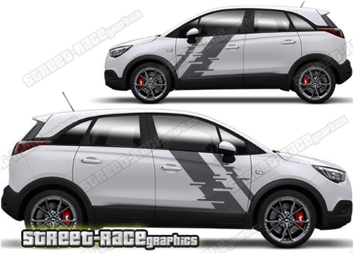 Vauxhall Crossland graphics. They are shown on the first generation Crossland but they can be trimmed to fit all later versions and facelift variants. The decals are not pre-cut for any specific Vauxhall Crossland version; they do not have any door handle cutouts, wheel arch or door line splits. These will require trimming during fitting. Vinyl will not stick to unpainted textured plastics.