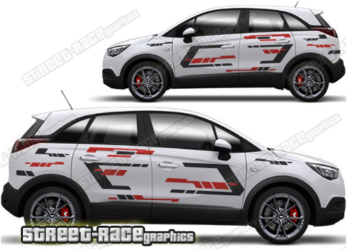 Vauxhall Crossland graphics. They are shown on the first generation Crossland but they can be trimmed to fit all later versions and facelift variants. The decals are not pre-cut for any specific Vauxhall Crossland version; they do not have any door handle cutouts, wheel arch or door line splits. These will require trimming during fitting. Vinyl will not stick to unpainted textured plastics.