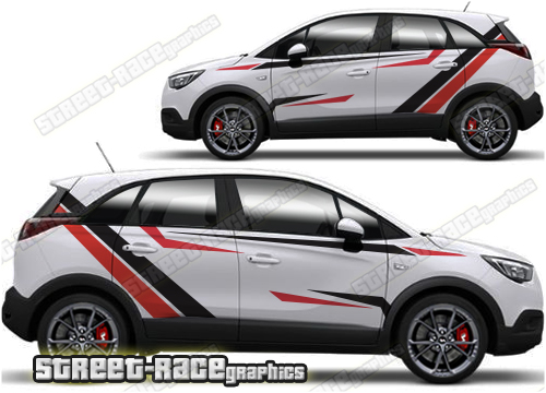 Vauxhall Crossland graphics. They are shown on the first generation Crossland but they can be trimmed to fit all later versions and facelift variants. The decals are not pre-cut for any specific Vauxhall Crossland version; they do not have any door handle cutouts, wheel arch or door line splits. These will require trimming during fitting. Vinyl will not stick to unpainted textured plastics.