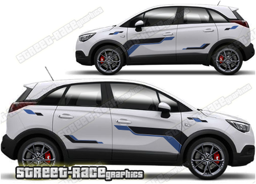 Vauxhall Crossland graphics. They are shown on the first generation Crossland but they can be trimmed to fit all later versions and facelift variants. The decals are not pre-cut for any specific Vauxhall Crossland version; they do not have any door handle cutouts, wheel arch or door line splits. These will require trimming during fitting. Vinyl will not stick to unpainted textured plastics.