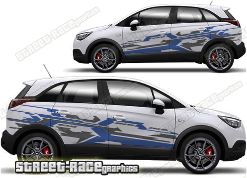 Vauxhall Crossland graphics. They are shown on the first generation Crossland but they can be trimmed to fit all later versions and facelift variants. The decals are not pre-cut for any specific Vauxhall Crossland version; they do not have any door handle cutouts, wheel arch or door line splits. These will require trimming during fitting. Vinyl will not stick to unpainted textured plastics.