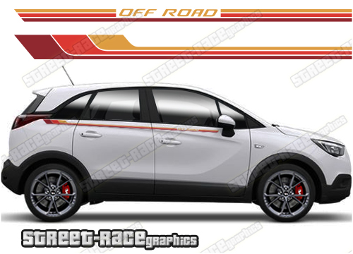 Vauxhall Crossland racing stripes. They are shown on the first generation Crossland but they can be trimmed to fit all later versions and facelift variants. The decals are not pre-cut for any specific Vauxhall Crossland version; they do not have any door handle cutouts, wheel arch or door line splits. These will require trimming during fitting. Vinyl will not stick to unpainted textured plastics.