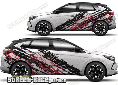 Vauxhall Grandland graphics. They are shown on the first generation Grandland but they can be trimmed to fit all later versions and facelift variants. The decals are not pre-cut for any specific Vauxhall Grandland version; they do not have any door handle cutouts, wheel arch or door line splits. These will require trimming during fitting. Vinyl will not stick to unpainted textured plastics.