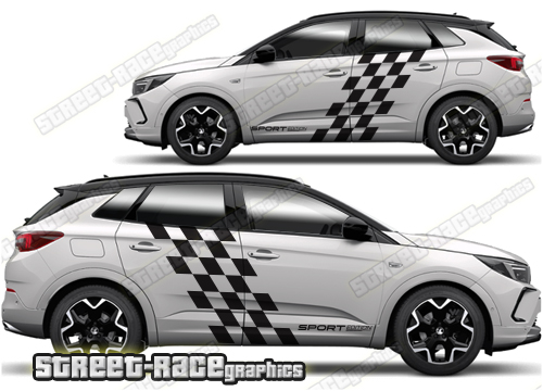 Vauxhall Grandland graphics. They are shown on the first generation Grandland but they can be trimmed to fit all later versions and facelift variants. The decals are not pre-cut for any specific Vauxhall Grandland version; they do not have any door handle cutouts, wheel arch or door line splits. These will require trimming during fitting. Vinyl will not stick to unpainted textured plastics.