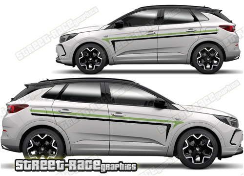 Vauxhall Grandland graphics. They are shown on the first generation Grandland but they can be trimmed to fit all later versions and facelift variants. The decals are not pre-cut for any specific Vauxhall Grandland version; they do not have any door handle cutouts, wheel arch or door line splits. These will require trimming during fitting. Vinyl will not stick to unpainted textured plastics.