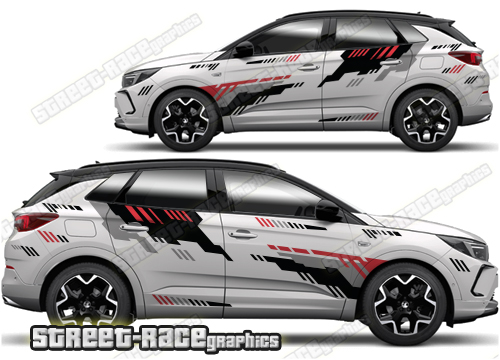 Vauxhall Grandland graphics. They are shown on the first generation Grandland but they can be trimmed to fit all later versions and facelift variants. The decals are not pre-cut for any specific Vauxhall Grandland version; they do not have any door handle cutouts, wheel arch or door line splits. These will require trimming during fitting. Vinyl will not stick to unpainted textured plastics.