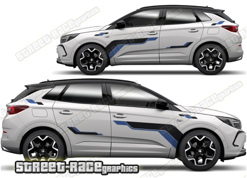 Vauxhall Grandland graphics. They are shown on the first generation Grandland but they can be trimmed to fit all later versions and facelift variants. The decals are not pre-cut for any specific Vauxhall Grandland version; they do not have any door handle cutouts, wheel arch or door line splits. These will require trimming during fitting. Vinyl will not stick to unpainted textured plastics.