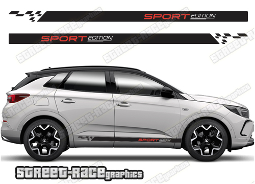 Vauxhall Grandland racing stripes. They are shown on the first generation Grandland but they can be trimmed to fit all later versions and facelift variants. The decals are not pre-cut for any specific Vauxhall Grandland version; they do not have any door handle cutouts, wheel arch or door line splits. These will require trimming during fitting. Vinyl will not stick to unpainted textured plastics.