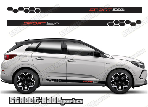 Vauxhall Grandland racing stripes. They are shown on the first generation Grandland but they can be trimmed to fit all later versions and facelift variants. The decals are not pre-cut for any specific Vauxhall Grandland version; they do not have any door handle cutouts, wheel arch or door line splits. These will require trimming during fitting. Vinyl will not stick to unpainted textured plastics.