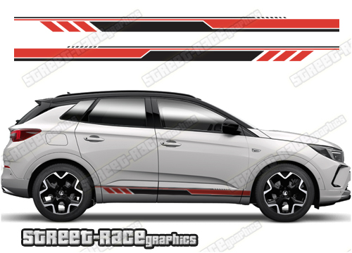 Vauxhall Grandland racing stripes. They are shown on the first generation Grandland but they can be trimmed to fit all later versions and facelift variants. The decals are not pre-cut for any specific Vauxhall Grandland version; they do not have any door handle cutouts, wheel arch or door line splits. These will require trimming during fitting. Vinyl will not stick to unpainted textured plastics.