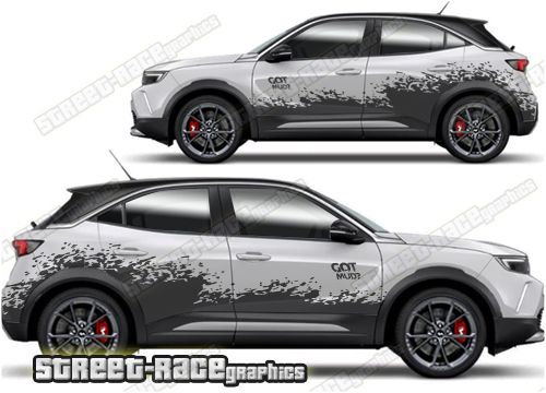 Vauxhall Mokka graphics. They are shown on the first generation Mokka but they can be trimmed to fit all later versions and facelift variants. The decals are not pre-cut for any specific Vauxhall Mokka version; they do not have any door handle cutouts, wheel arch or door line splits. These will require trimming during fitting. Vinyl will not stick to unpainted textured plastics.