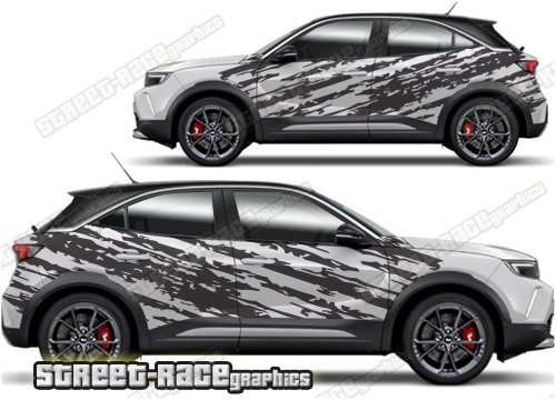 Vauxhall Mokka graphics. They are shown on the first generation Mokka but they can be trimmed to fit all later versions and facelift variants. The decals are not pre-cut for any specific Vauxhall Mokka version; they do not have any door handle cutouts, wheel arch or door line splits. These will require trimming during fitting. Vinyl will not stick to unpainted textured plastics.